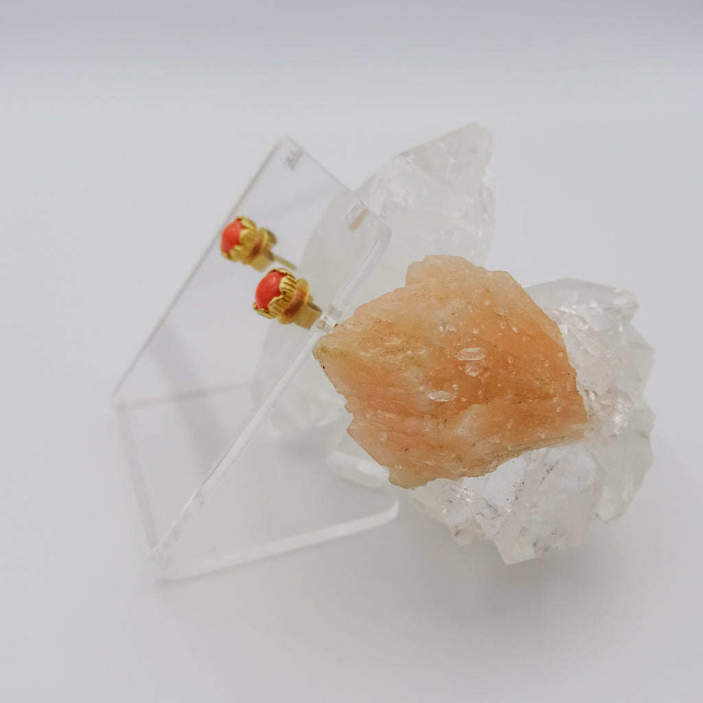18k gold studs earrings with gemstones red coral set in a flower shape
